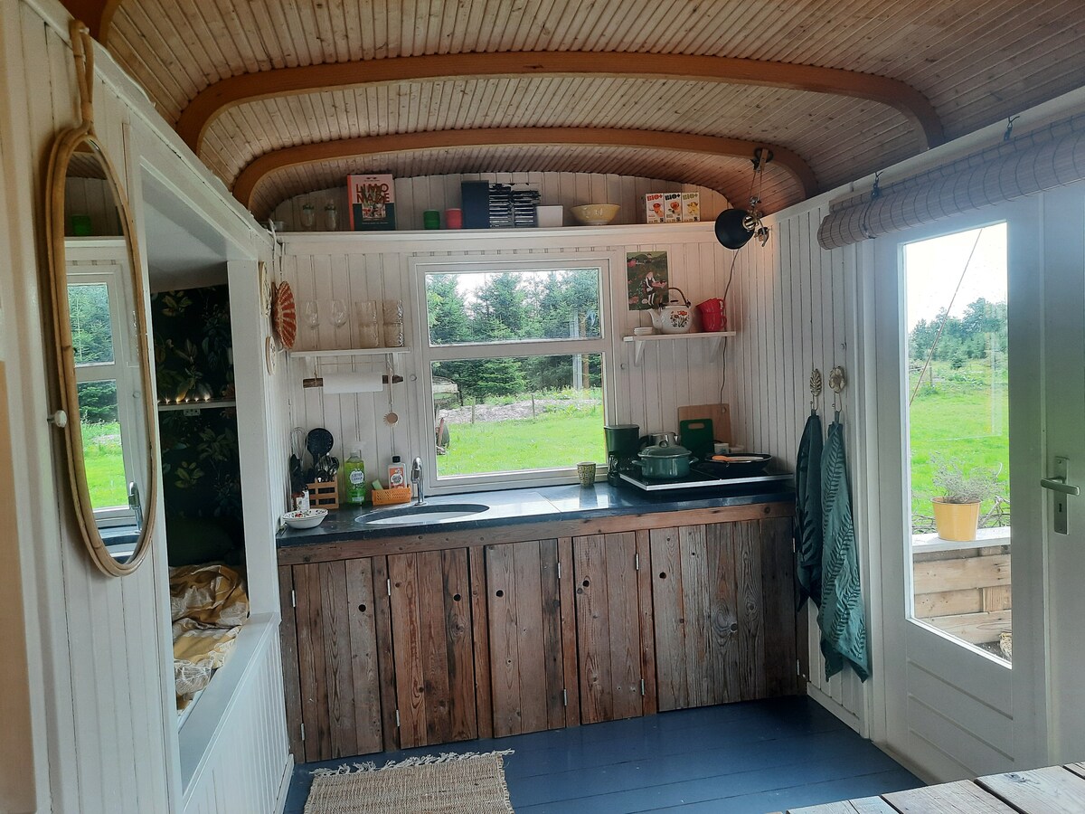 Wake up in an open space in the middle of the meadow between cows and overlooking pine forest and roaming pigs. The hut is located on the grounds of 2 hectares where a permaculture vegetable garden is located and the construction of a food forest is started. The cabin has a beautiful open location with its own terrace and a fantastic view. The hut is full of comforts and is very attractively decorated.