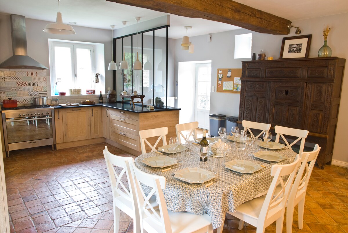Warm and friendly in a bucolic setting. Comfortable rooms, spacious living room, large well-equipped kitchen, garden, pond, terrace, playground, barbecue... and the barn with ping pong, banquet table... Ideal for your family events, reunions with friends, business trips... Optional 6th double bedroom and breakfast basket €8/person to be booked 48 hours before. We are available for any special requests.