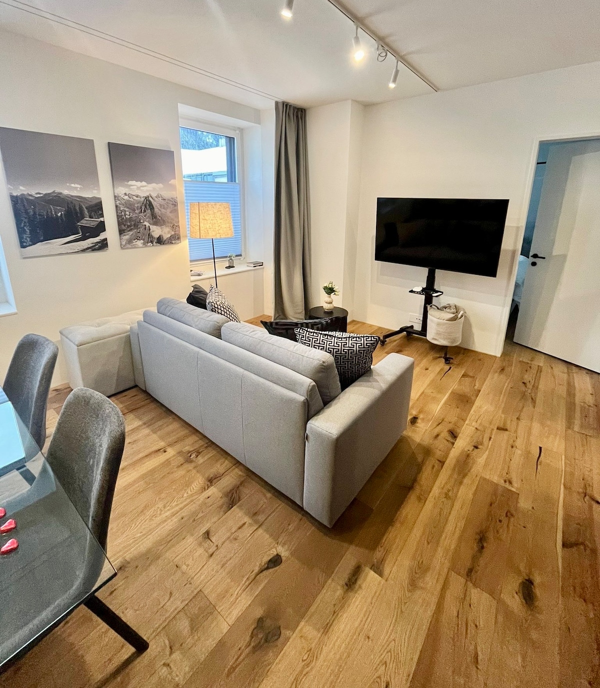 A new apartment in old walls awaits its guests. It is located directly on the Landwasser. The Rinerhornbahn and Davos Glaris train station / bus stop are a 2-minute walk away. The modern kitchen is integrated into the living room. A separate bedroom and the bathroom in blue complete the apartment. 2 rooms - seating in front of the apartment - garage space for car, skis & bike - family-friendly - Davos Klosters Premium Card included.