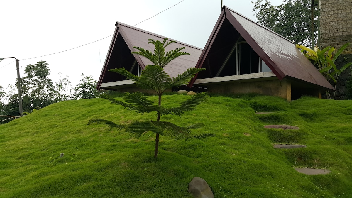 Vila dengan desain yang modern dan unique, bentuk bangunan yang kubus miring dengan kaca besar view langsung ke langit bintang dan bulan. Keren banget untuk foto - foto sosmed, berasa foto di luar negeri. Lokasi di perumahan elite, aman dan nyaman. Terdapat 2 villa bisa untuk 12 orang. Kebun halaman yang luas 2000m2, parkir luas. Banyak cafe disekitarnya.