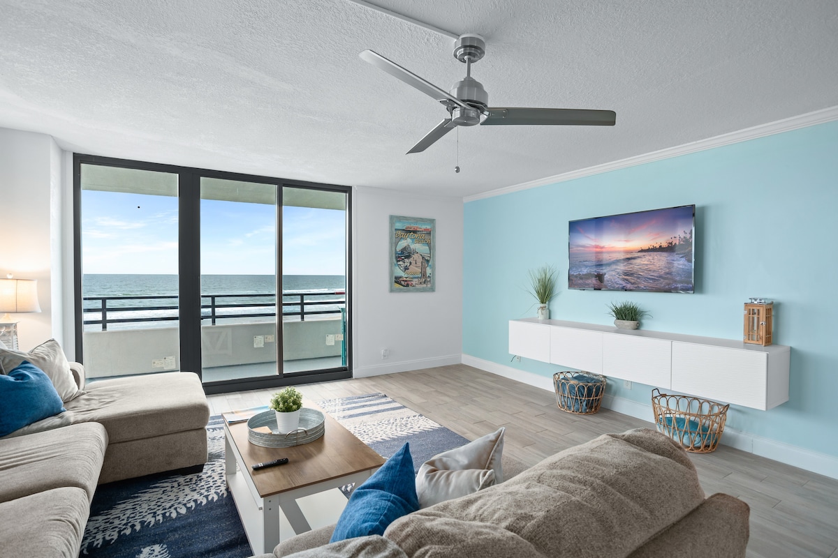 STUNNING BEACHFRONT VIEWS! Luxury renovated condo + panoramic ocean vistas. Master king suite private oceanfront balcony + 2nd bedroom & bath = 2 queen beds. NEW fully stocked kitchen! Direct access to pristine no-drive beach w/ soft/firm sand, heated oceanside pool. Premium family-friendly retreat - smoke & pet-free. Wake to magnificent Atlantic sunrises! Tranquil Daytona Beach Shores escape - book for your relaxing fun beach vacation! Tastefully decorated for Christmas!