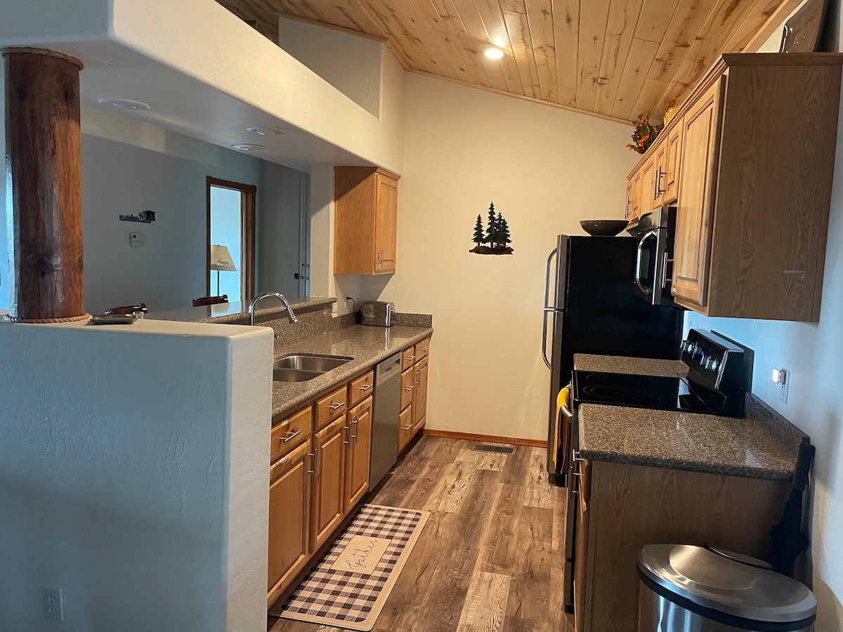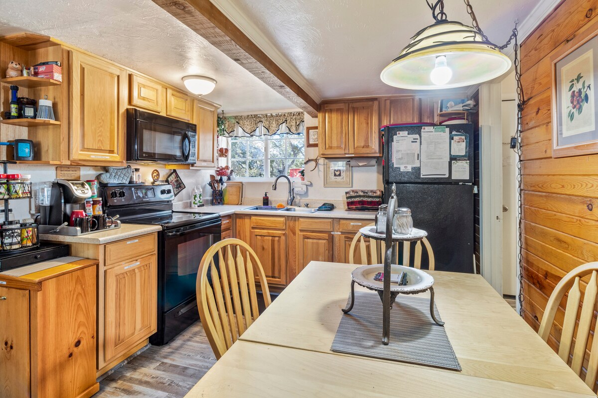 Beautiful A frame cabin with full amenities. Full kitchen with cookware, oven and stove, refrigerator and microwave. Keurig coffee pot, so bring your favorite k pods. Full bathroom with shower/bathtub. Relax with the whole family at this peaceful place to stay. Beautiful wood throughout in a quiet setting and a big loft for the whole family. New HVAC system added in 2022. Keeps the family cozy in the winters and cool in the warmer summer days. Beautiful tongue and groove pine throughout.