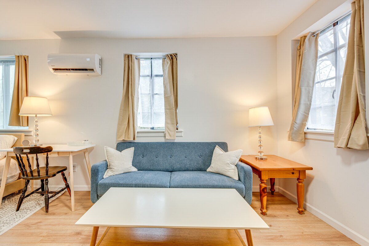 Sunny-ALL PRIVATE Garden Suite! ONE Queen bed--prime bedding, a loveseat, full bathroom with shower (no tub), a kitchenette w. 2 electric burners, small refrigerator, microwave, toaster, blender, waffle maker, and coffeemaker. Highspeed Wi-Fi. Just redecorated with noise control wall, premium bedding, google home, and Netflix already installed! Note: Only one parking space assigned.