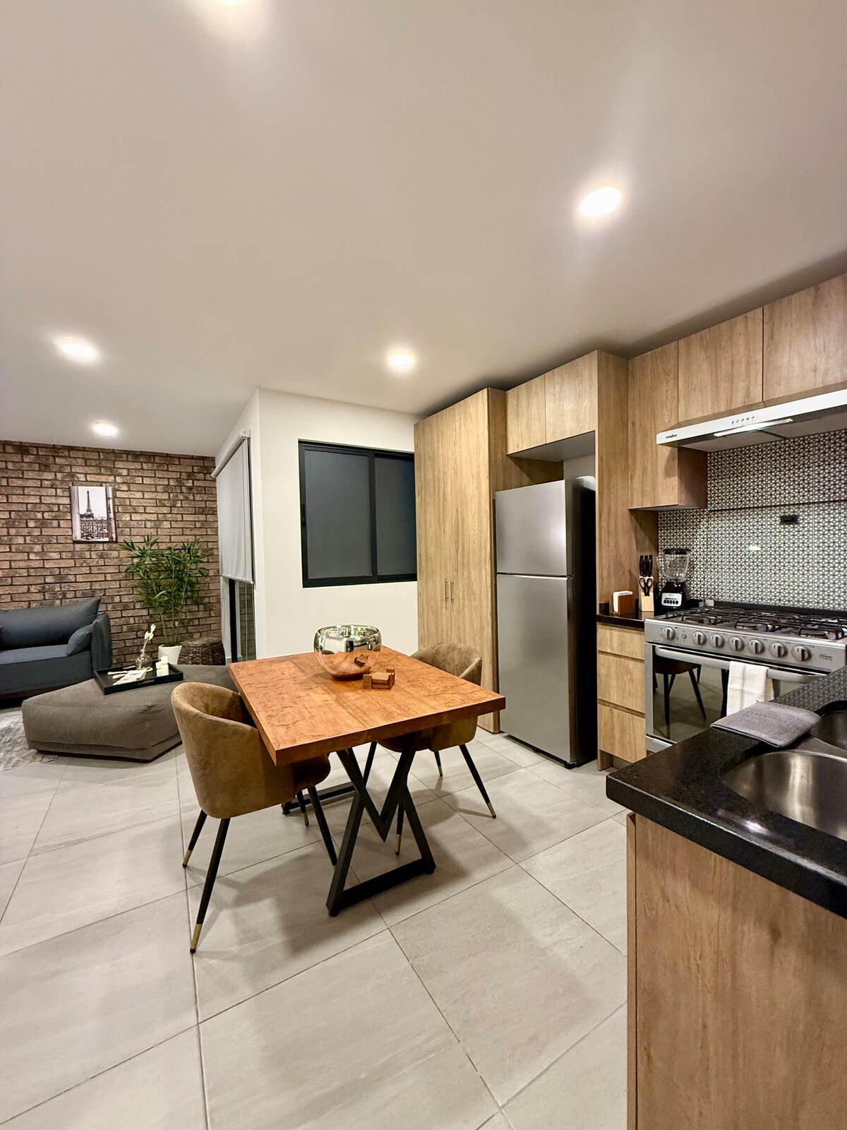 Moderno y confortable depto. tipo estudio con distribución funcional y estilo contemporáneo. Cuenta con recámara, baño completo y medio baño, cocina abierta equipada, estancia con sofá cama y escritorio ideal para home office. Ubicado en edificio reciente en zona céntrica y estratégica en Colonia del Valle Centro, rodeado de cafés, restaurantes y supermercados, con excelente conexión a las principales vías. Ambiente tranquilo, práctico y acogedor, ideal para viajes de trabajo, paseo o descanso.