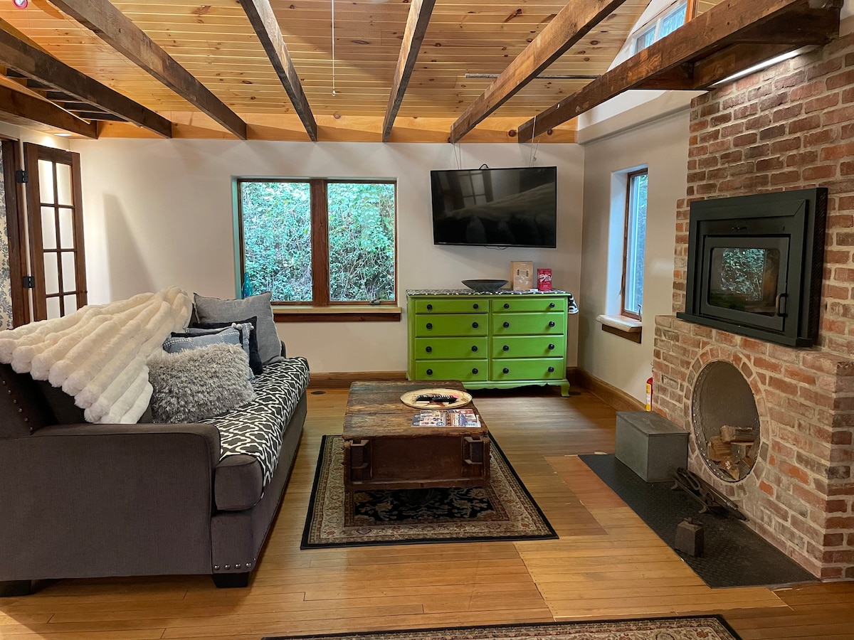 Take it easy at this unique and tranquil getaway. The entire home has been newly renovated with thoughtful touches and an eclectic feel. Conveniences include a wood stove, sleep number mattress, Viking gas stovetop/oven, deck facing river with propane grill, a covered carport entry, and a 180* river view at the top of the property! We are very excited to welcome guests and hope to provide a memorable experience for all. Well behaved dogs welcome upon request. Wood stove $25/night.