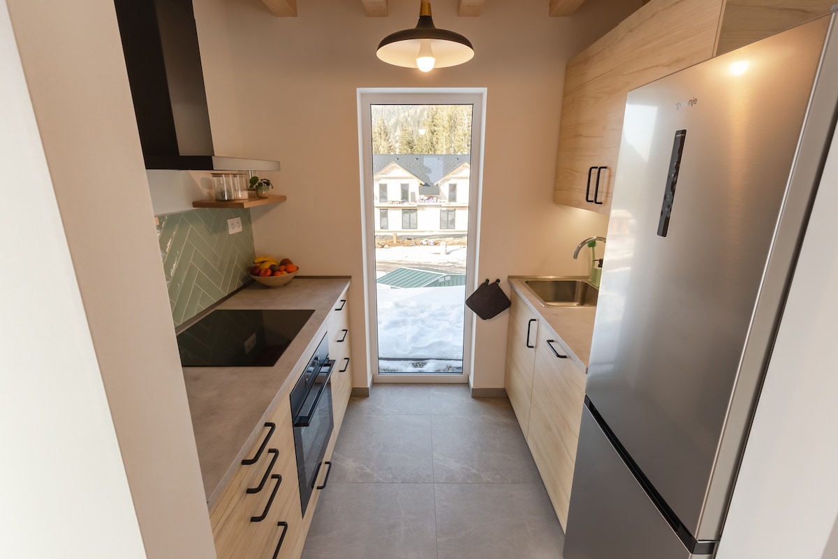 A 33 sqm shelter house studio with a balcony in a protruding dormer window, with a beautiful view of the Western Tatras. Spacious, 4-meter interior finished with larch wood. King size bed 180x200 cm with the option of splitting into 2 singles. Kitchenette with dishwasher, fridge, microwave, toaster, coffee maker. A 100 cm wide sofa bed makes the studio comfortable for 2 people or 2 people with a child. Open space bathtub, toilet with sink in a separate room.