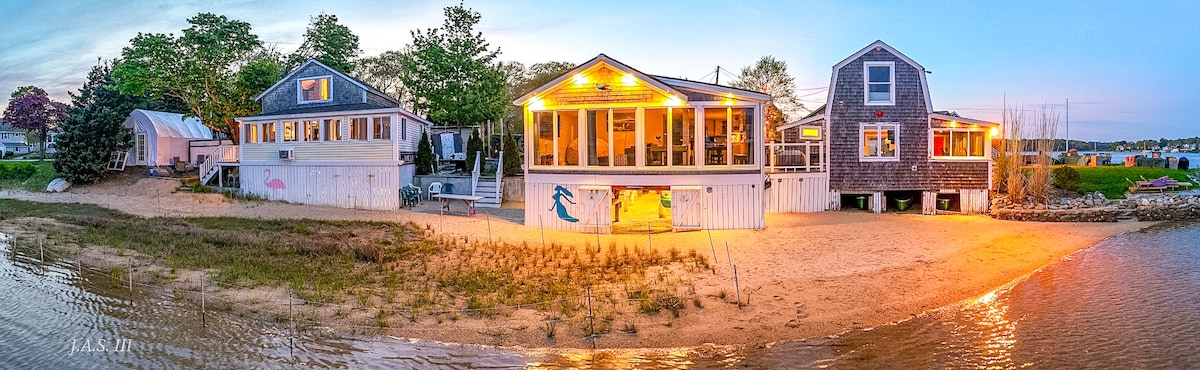Water front on Frost Fish Creek! This recently renovated 3 bedroom (sleeps 9) 2 bath home is tucked off the road in a private oasis with panoramic water front views from almost every room. The bright open floor plan with fireplace, blue slate floors, high open ceilings to second floor, three pairs of sliders that boast nature, water views, fire pit, and screened in lounge and abundant sunlight. Walking distance to a small private dog friendly beach. Driving distance to many great beaches.