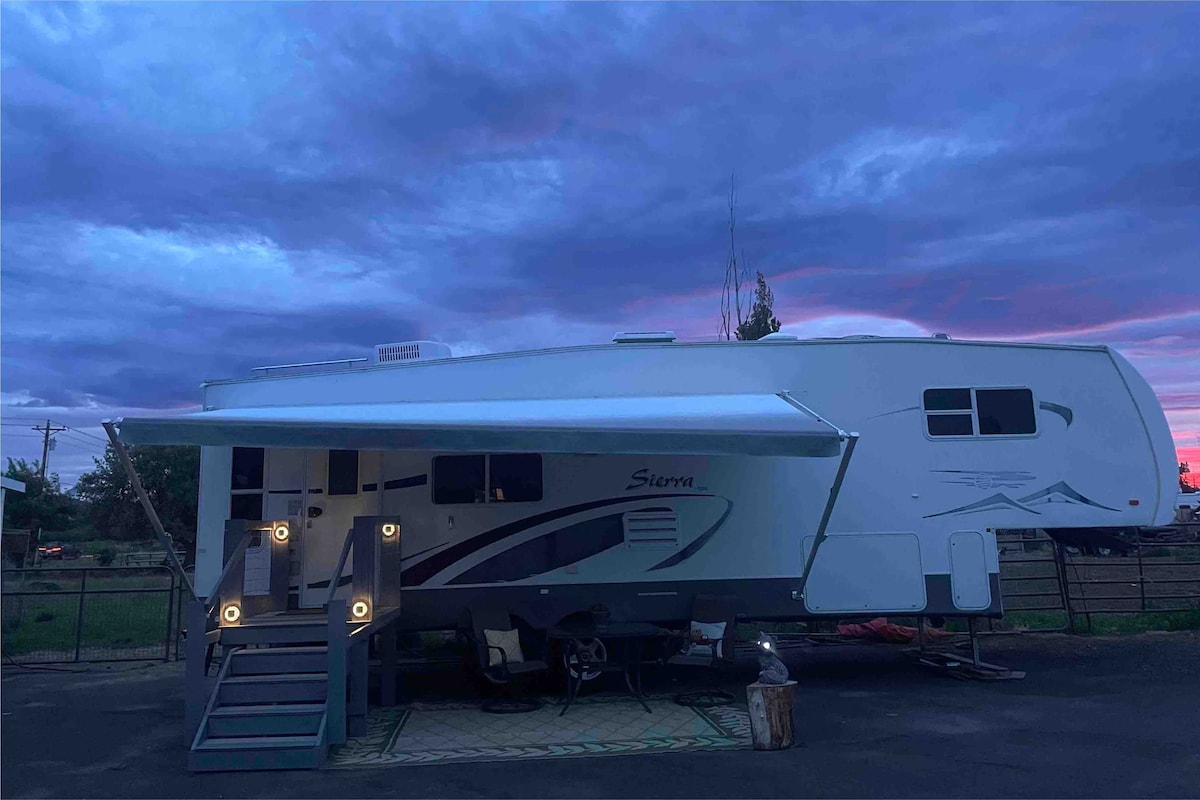 Stay in our homey, 42' 5th wheel! We call it the Glamper because it's not your typical camper! Relax with a glass of wine from one of the many vineyards nearby, in front of the fireplace. Watch some TV from the king sized bed. Rest peacefully in the quiet country! There's plenty of space for parking, a horse trailer or boat. The Clark County Event Center, RV Inn Style Amphitheater and I-5 are 3 miles away.