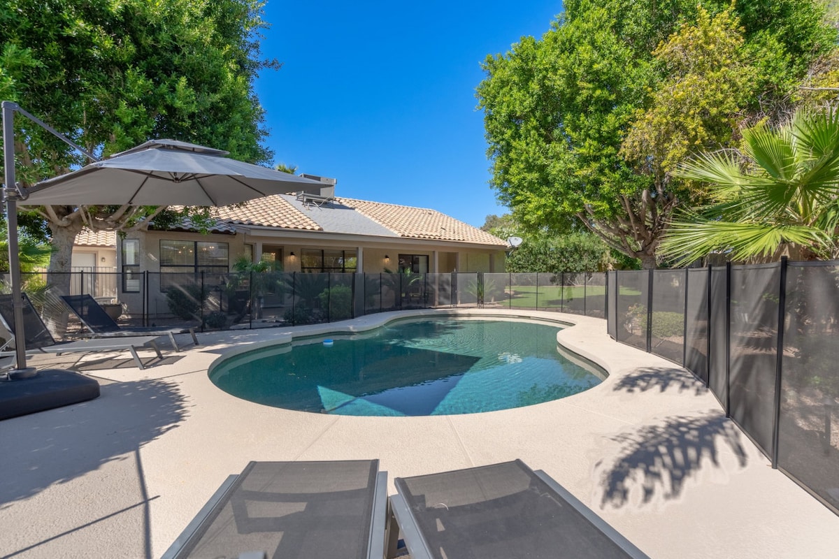 Immerse yourself & take a break at this peaceful oasis. Open floor plan with a magical Arizona room and ultra private backyard. Complimentary heated swimming pool. A+ location close to parks, hiking trails, Kierland, Costco and the best restaurants. Flexible living spaces w/2 different livings rooms with smart TV's & game room with a pool table. The Arizona room is ideal to relax while enjoying the pool and backyard views. Super comfortable beds! We support equality! You will love it!