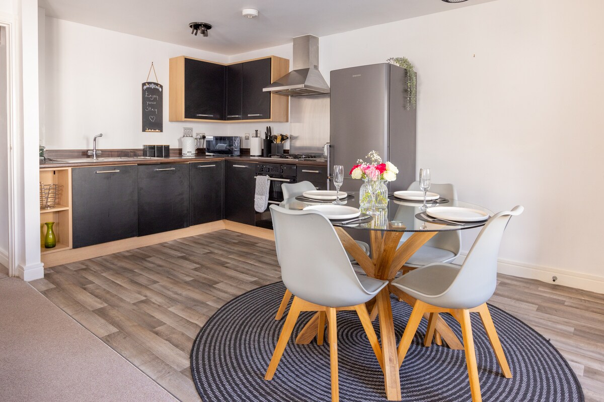 A stylish 2-bed apartment just 3 minutes from Plymouth Hoe. Featuring a bright open-plan living space with fully equipped kitchen, dining area, lounge, Smart TV, Bluetooth speaker, and 400mb broadband. The Blue Room offers a double bed, while the Sunshine Room has a super-king bed and private balcony. Enjoy a modern bathroom with walk-in shower, bath, and utility room. Includes plush linens, towels, and rare private on-site parking. Perfect for comfort, convenience, and luxury.