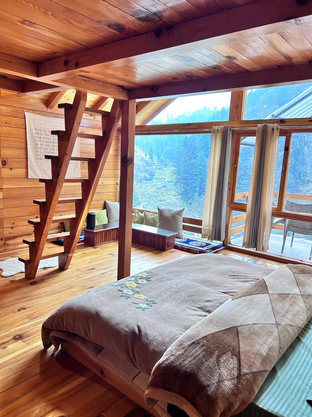 A beautiful wooden cabin designed for a cozy and peaceful stay, surrounded by nature. With warm wooden interiors, large glass windows, and scenic views, this cabin is perfect for couples and solo travelers looking to relax, unwind, and reconnect with nature.