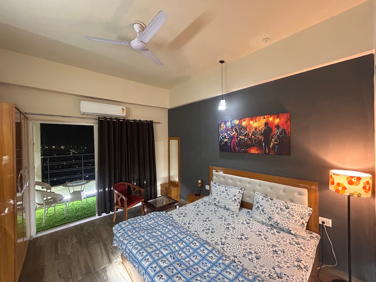 About This Property:- ✨ Master Bedroom – Featuring a Super King-size bed with an ultra-luxury Sleepwell mattress (worth ₹1.3L) for unmatched comfort, a 3-seater plush sofa, split AC, smart ceiling fan, 65-inch Android QLED TV with JBL soundbar, attached washroom, and thoughtfully designed lighting that creates a cozy, welcoming vibe. 🌿 Spacious Garden – Enjoy a 330 sq. ft. private garden with a stylish seating area, perfect for moonlit nights with fancy warm wall lights for a serene ambiance.