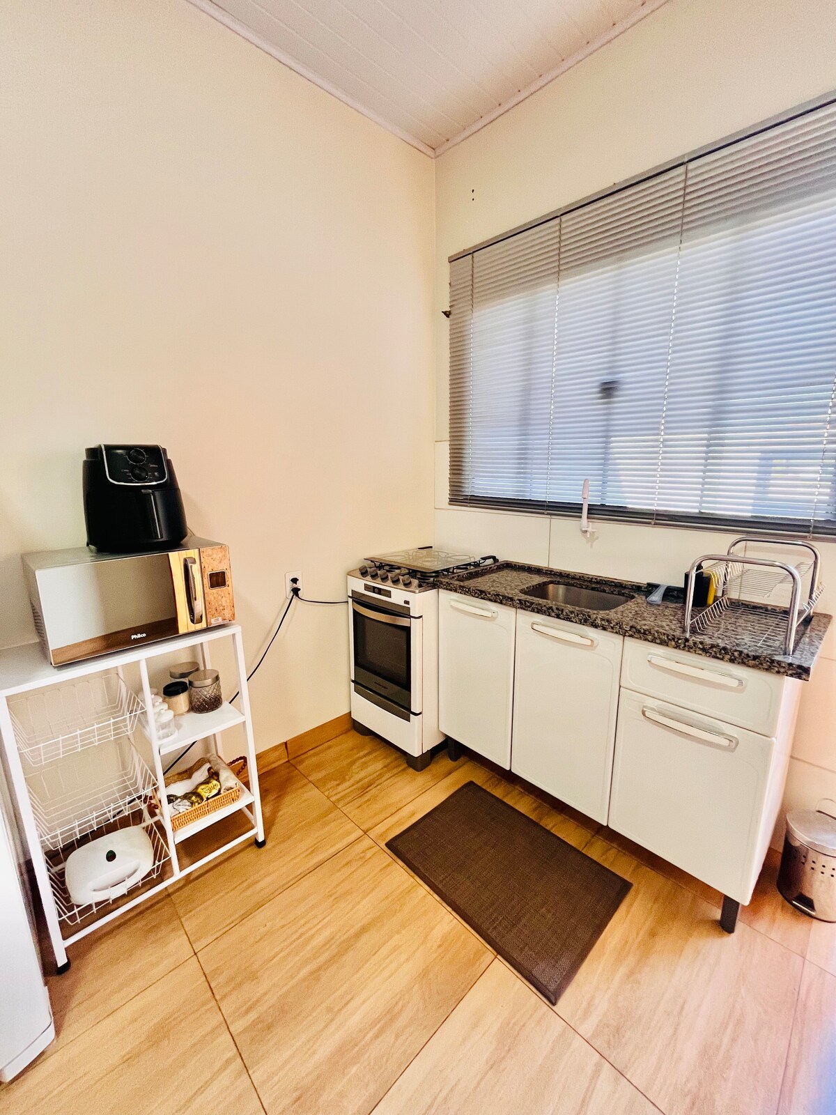 - Dois quartos confortáveis, com cama de casal, um equipado com ar-condicionado e o outro com ventilador, garantindo noites tranquilas em qualquer estação. - Sala de estar com sofá e TV e uma cozinha completa com fogão, geladeira, micro-ondas, pia, talheres e panelas. - Na lavanderia, há uma máquina de lavar disponível para sua comodidade, basta solicitar o uso ao anfitrião. - A garagem para um carro. - Próximo a supermercado, restaurantes, comércios e um bosque para corridas ou relaxar.