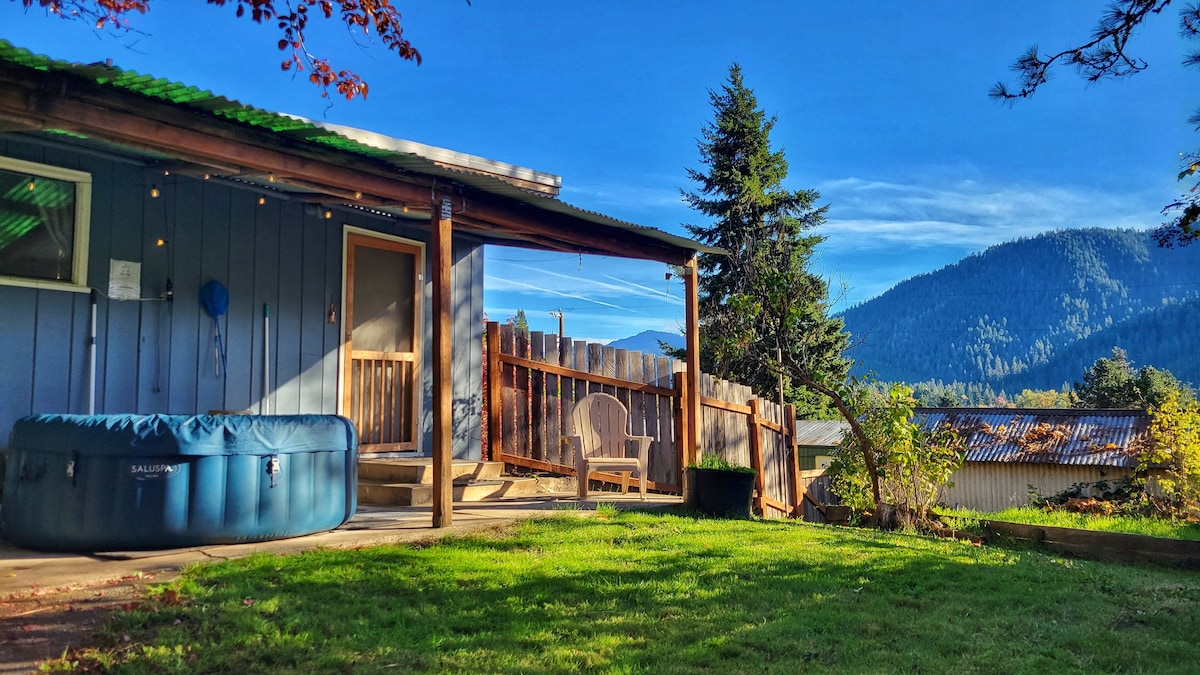 Kick back and relax at this peaceful 2 bedroom on a hill in uptown Oakridge. Your side of this duplex features on site parking, 2 bedrooms, a fenced backyard, full washer and dryer, and a private hot tub on your back porch. The property is within walking distance of 3 Legged Crane Brewery (the pub), Mane Street Coffee, the Corner Bar and Grill, the post office, and the library. Great for a bike trip, hiking, frisbee golf, a visit to Willamette Pass, or Crater Lake! Free Parking on site!