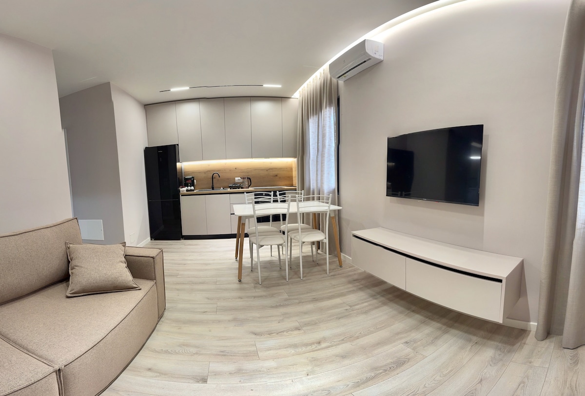 Lovely apartment (a bedroom and a living room plus kitchen area) on the 10-th floor of a new building,, located just minutes away from the New Boulevard and very close to the National Sport Park, Tirana. Major attractions are 15-20 minutes walking distance from the apartment, such as Pazari i Ri (The New Bazaar), Skanderbeg Square and Bunkart 2.