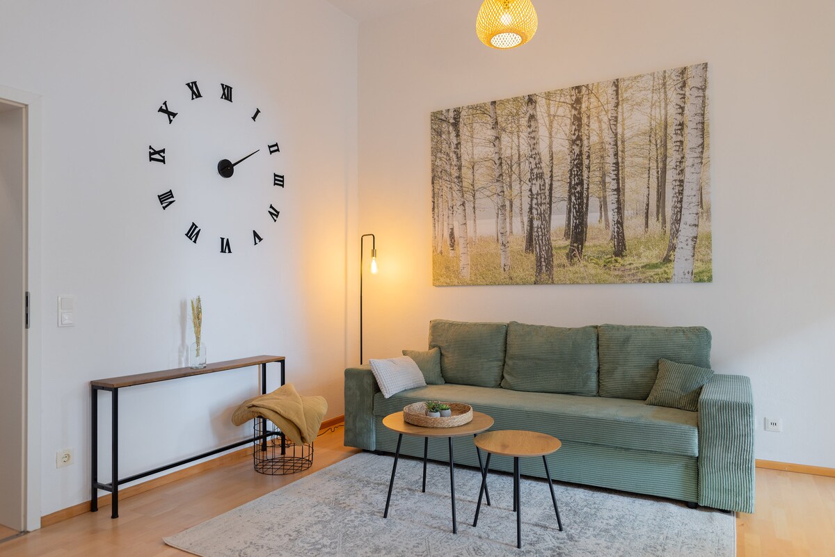 This centrally located, modern 3-room apartment can accommodate groups or families and has six single beds. Bright, stylish rooms create a pleasant atmosphere. The fully equipped kitchen and the well-kept bathroom with shower provide comfort. In the living room you will find a large TV and a cozy workplace. In addition, there is a balcony where you can relax. Self check-in and hotel quality beds and bedding.