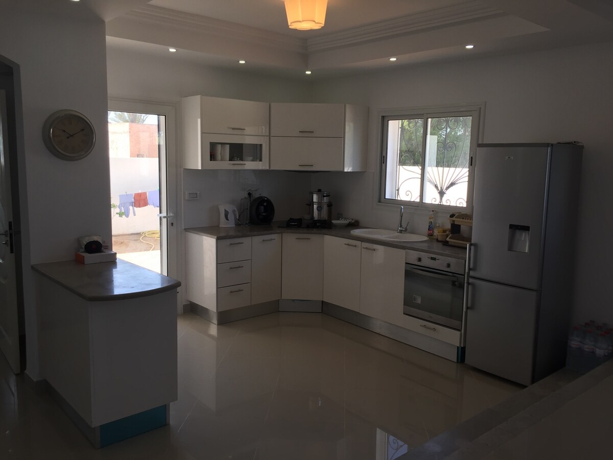 New villa , very spacious consists of 4 double bedrooms, two pretty walk-in showers a modern and very comfortable living room, a fitted kitchen overlooking the living room ,as well as a beautiful infinity pool with no overlooks, terraces high up offering an unlikely view and total change of scenery on the palm grove and lighthouse above which the sun rises . The villa is 3 minutes from the city center of Midoun , the most lively city on the island and 3 minutes from the beach .