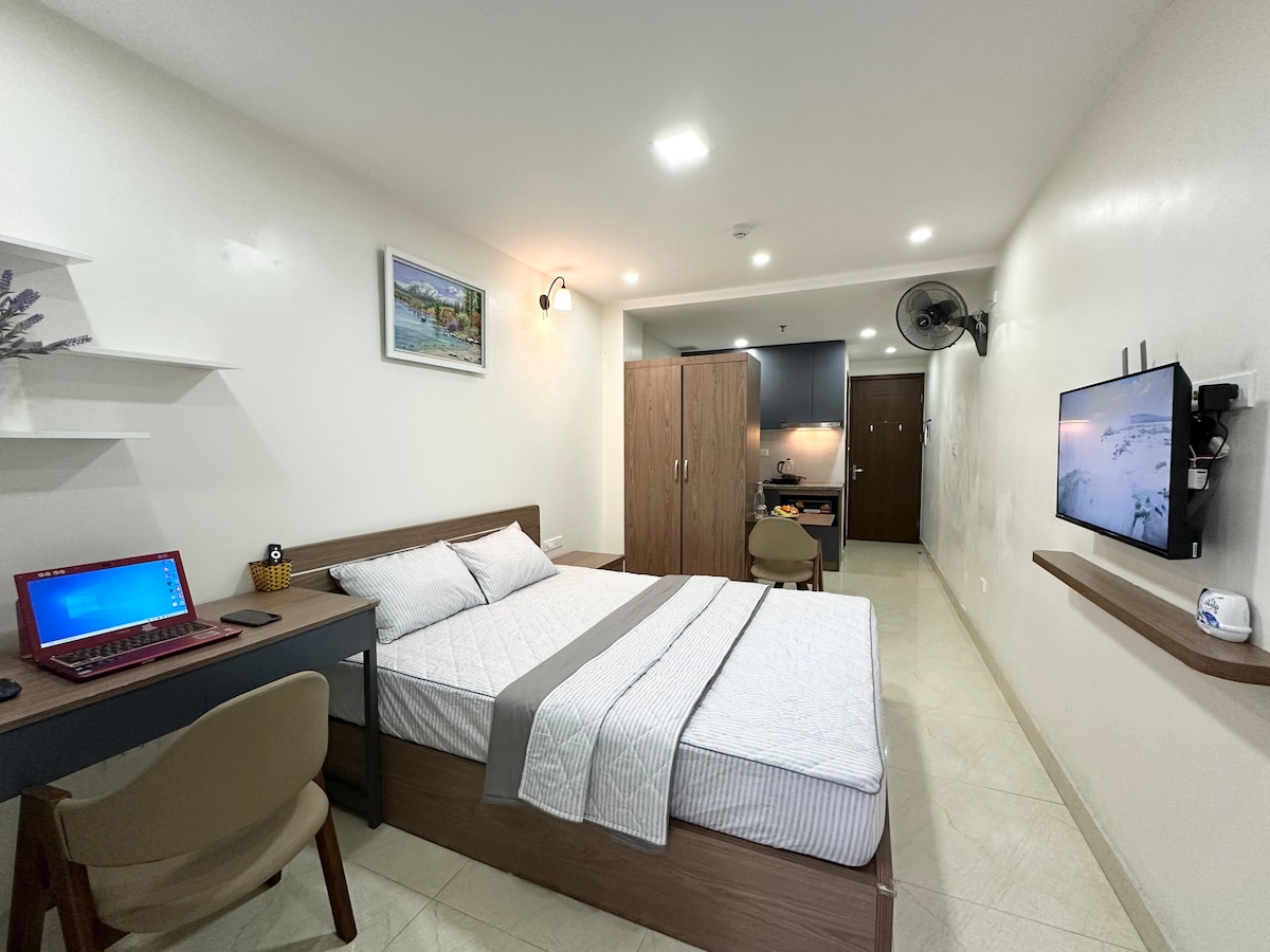 🌸 Love Studio – 3rd Floor, City Center Hanoi Sweetly decorated 30m² studio with bright windows and peaceful vibes. Features a comfy double bed, work desk, private kitchen, fridge, ensuite bathroom, and 55” Smart TV with Netflix. Enjoy sunshine and city views from the 7th-floor balcony. Ground floor has a shared kitchen, cozy living area, and free self-serve coffee. Free motorbike parking. Ideal for couples, business travelers, or long stays – private, cozy, and convenient