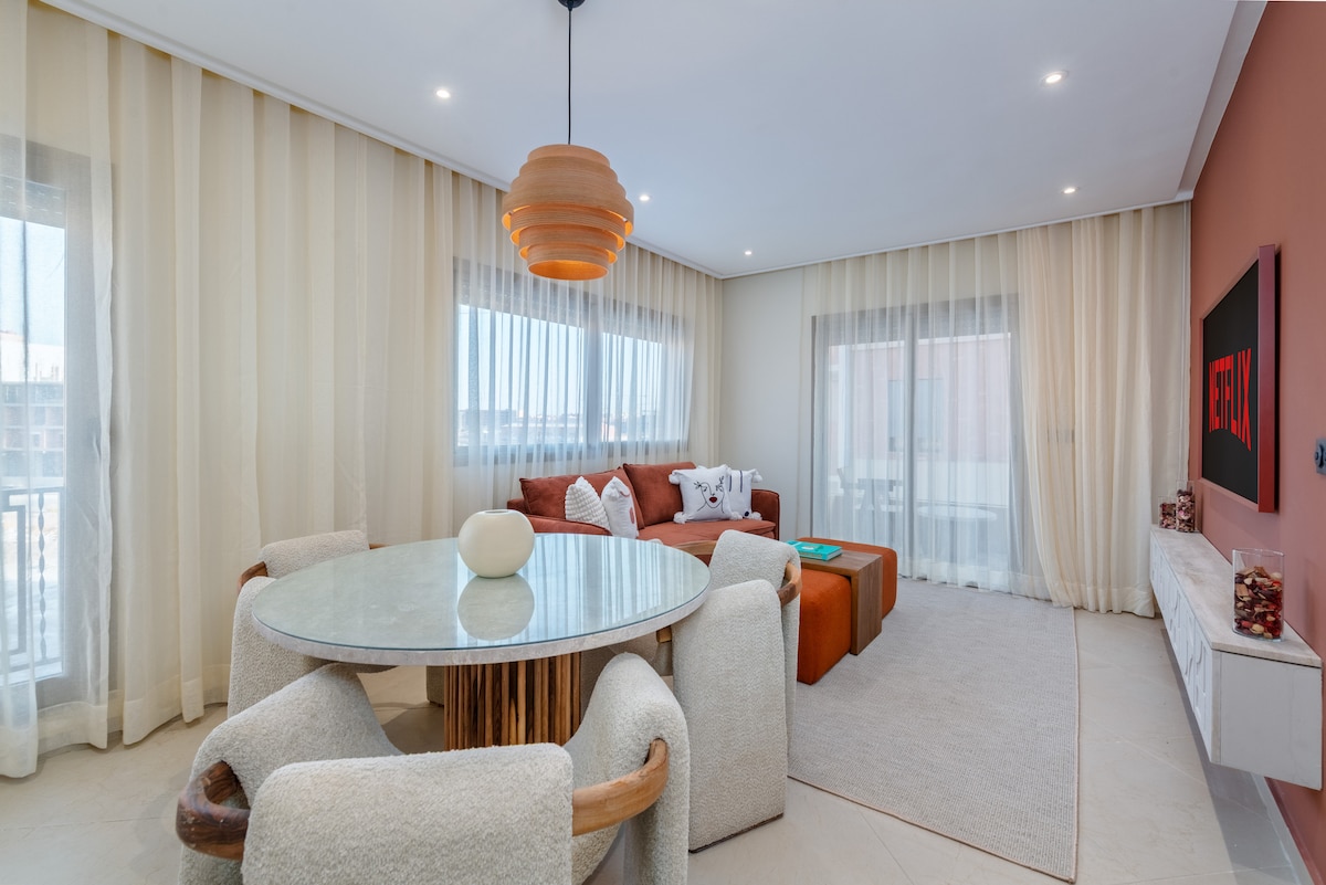 confort et sérénité au cœur de Marrakech. Cet appartement allie style contemporain et artisanat marocain, offrant une atmosphère paisible et raffinée. Situé à 2 min de M Avenue, 5 min de Guéliz et 10 min de l’aéroport et de Jemaa el-Fna, il dispose d’une terrasse ensoleillée, d’un accès piscine, du Wi-Fi fibre, d’une TV 45’’ Netflix Un véritable havre de paix moderne pour découvrir Marrakech.