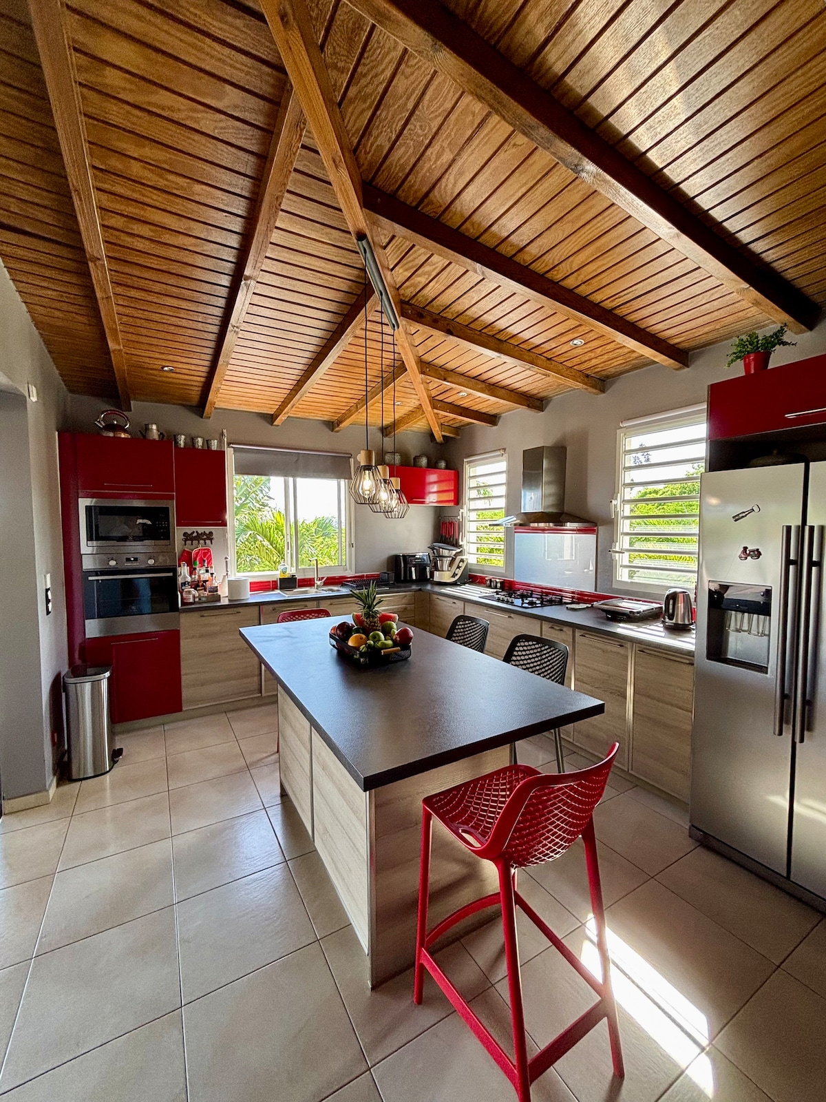 Perched on the heights of Deshaies , overlooking the Caribbean Sea, the island of Montserrat and Kawan Island, this detached house stands in the middle of a 3ha park rich in local species (botanical park on a total plot of 5ha). This enchanting and timeless setting is only a 5-minute drive from the magnificent Grande Anse de Deshaies beach and the Pearl beach. The accommodation includes 2 air-conditioned bedrooms, a kitchen-living room and a bathroom (wc & shower)