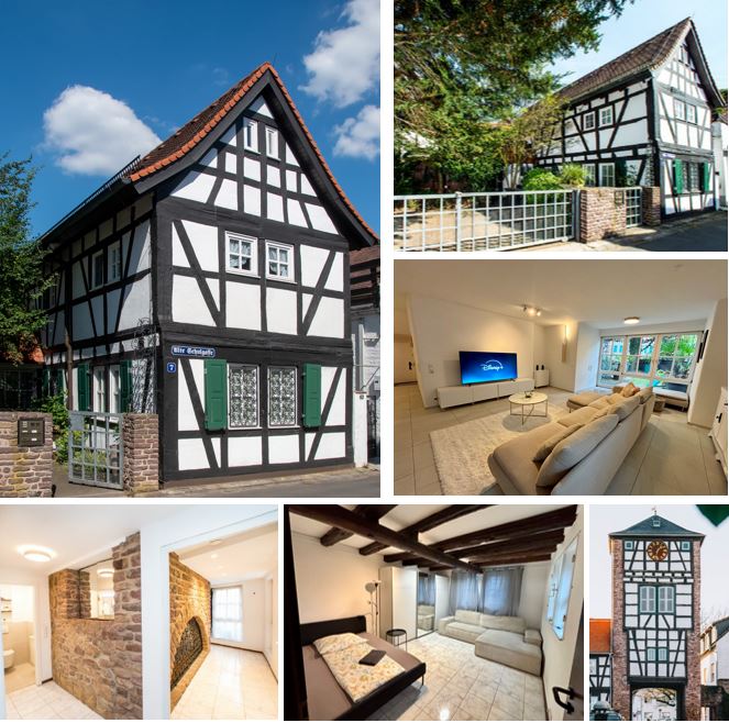 This newly renovated apartment (Apartment 2 of 2) is located in the cultural monument "Trierischer Hof" and is in the old town of Dreieich-Dreieichenhain. There is another apartment for 5 people available in the house. Enjoy modern comfort in a historic ambience, with direct access to the sights of the old town. The castle is just a 1-minute walk away. Dreieich-Dreieichenhain train station with a direct connection to Frankfurt am Main is a 10-minute walk away.