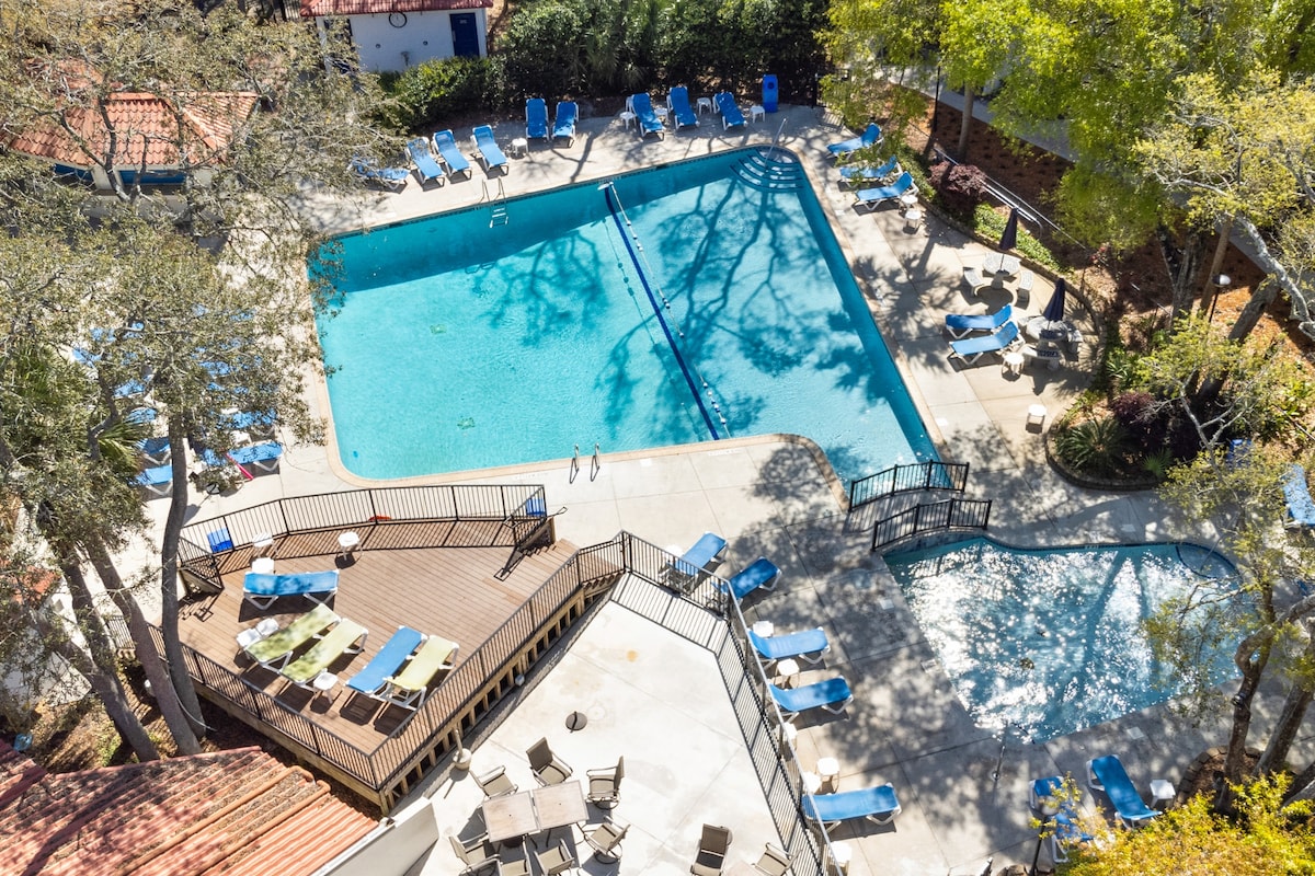 Enjoy amazing ocean sunrises from spacious 1-BR Jekyll Island condo! Next to secluded beach and short walk to famous Driftwood Beach. Updated, ground-level unit sleeps 4 (with pullout sofa). Extended patio offers panoramic shoreline view. Condo complex has pool, fitness center, volleyball, basketball, playground, bike rentals, picnic tables/grills, restaurant and more. One dog (60 lbs. max) OK with $75 fee. Sorry, no cats. For stays longer than 7 nights, contact host for special discount.