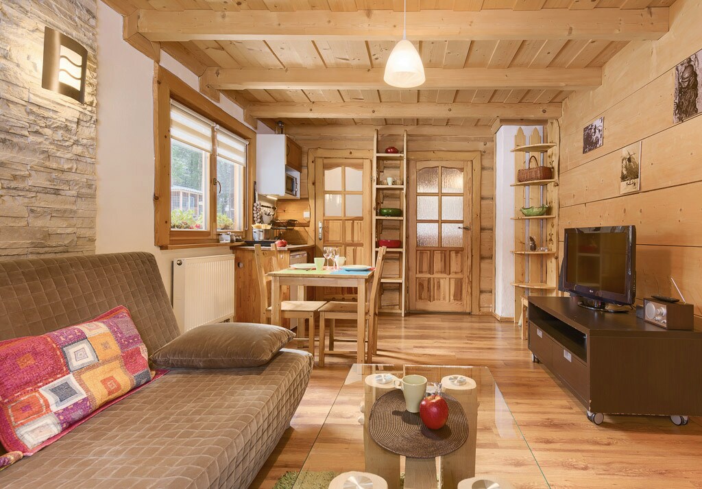 Horna Koliba is a beautiful house, built in the highland style. Built of logs, covered with wooden shingle with beautiful highlander details - the house looks like a picture. The living room connects with the glass veranda, which gives the interior an original and cozy character. The fireplace will put you in a romantic mood both in winter and summer. Idyllic views and intimate atmosphere will make you forget about everyday problems and blend in with this unique climate.