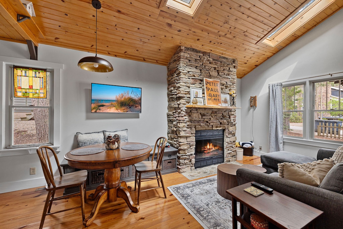 Come fall in love with Michiana Shores, we promise you'll love the peace and quiet. Our charming cottage sits back tucked away, nestled among pine trees and twinkle lights. Roast marshmallows while sitting around the fire with 6 modern adirondack chairs, take a stroll to the beach, ride bikes, BBQ, watch the sunset along lakeshore drive. Play tennis or pickle at the local park. 10 minute walk to the beach. Far away enough to relax yet close enough to new Buffalo, Union Pier or Long Beach