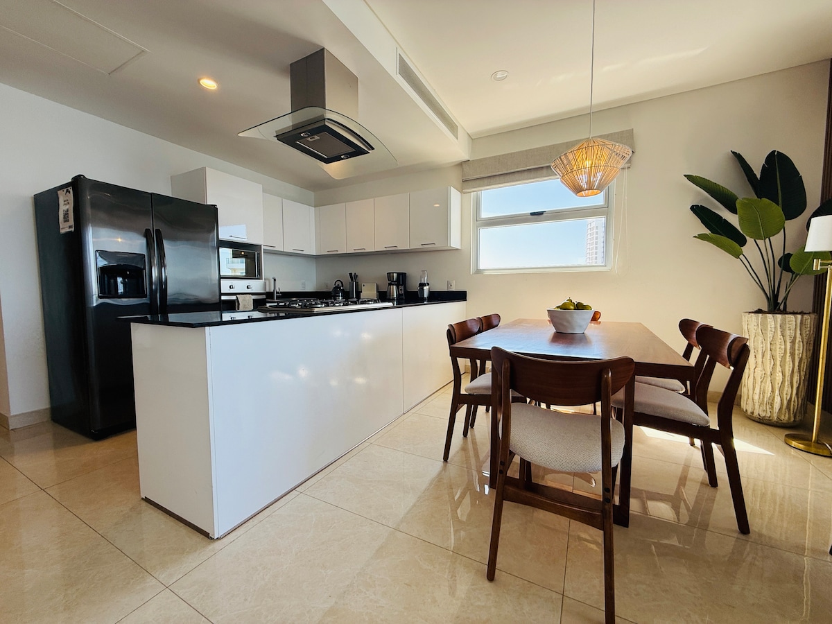 Enjoy luxury and modernity in this exclusive apartment in Mazatlán. From the balcony, take in spectacular sunsets over the ocean. Located in one of the port’s top condominiums, you’ll have access to first-class amenities: an infinity pool, spa, and relaxing common areas. The private beach is spacious and pristine, perfect for special moments with friends or family. Experience a unique stay in a space designed for your comfort.