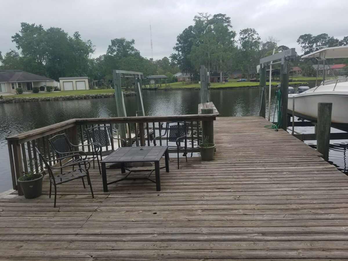 Deep water access to anywhere in Jacksonville with dock available. Back yard pavilion gazebo 50 feet from river connecting to a bungalow river home and landscaped pool. Bring your boat and tie up to the dock, or enjoy the provided kayaks and canoe. Home is available for out of town guest only. Two beds, four guest and plenty of room on couch