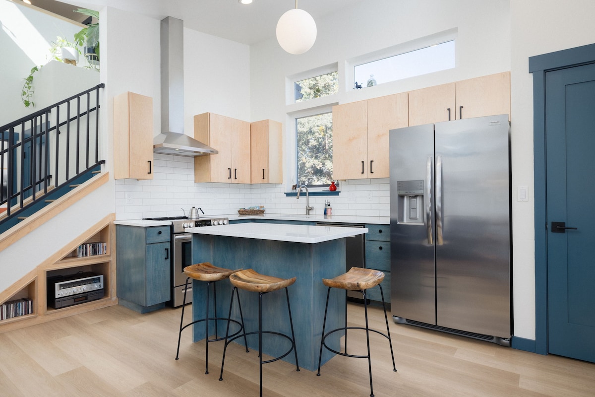Enjoy our new custom-built ADU located a block away from the Deschutes River in a quiet residential neighborhood, just a 10-minute walk from downtown along the River Trail. In this modern, bright, and private space, you'll enjoy the luxuries of hardwood floors, waterfall countertops, a built-in workspace, heated tile bathroom floors, a 55" Smart TV, BBQ and fire pit, and endless hot water—plus off-street parking and EV charger. One king bed, one daybed with a trundle, and one queen sleeper sofa.