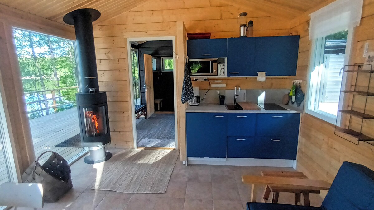 Relax and enjoy your stay in this scenic location, on the shores of a lake in a forest landscape. In addition to the sauna, the beach sauna has a fireplace room with a kitchenette. Hot and cold water comes and goes to the sauna and kitchen. The terrace has a gas grill for free use. Modern sauna cottage at a lake. Nice views to the lake from the living room, sauna and the bedrooms, which are in a separate building a few meters from the sauna-cottage.