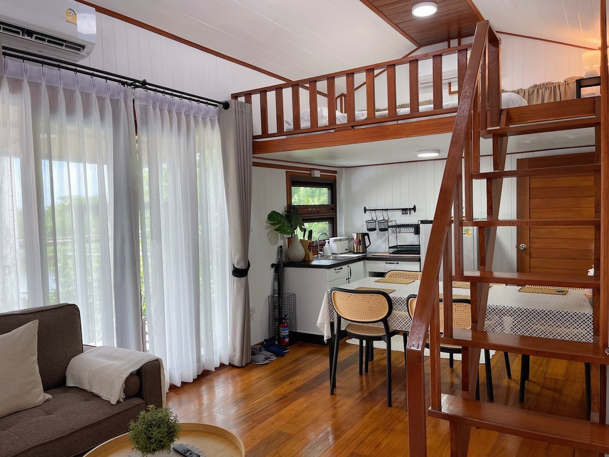 Up to 35% - long stays during low season. 2023 built, simple bungalow, big balcony, spacious bathroom with walk-in shower. Tinted windows from floor to ceiling, blackout curtains + mosquito nets. Equipped for a short or long vacation, right in the heart of Lonely Beach village. Hairdryer, toaster, kettle, microwave, fridge, TV, aircon, floor fan, workspace, large king-size bed, clothes boxes, clothes hanger, safe deposit. The exact location is on the map - Bamboo Hut restaurant, no fraud.