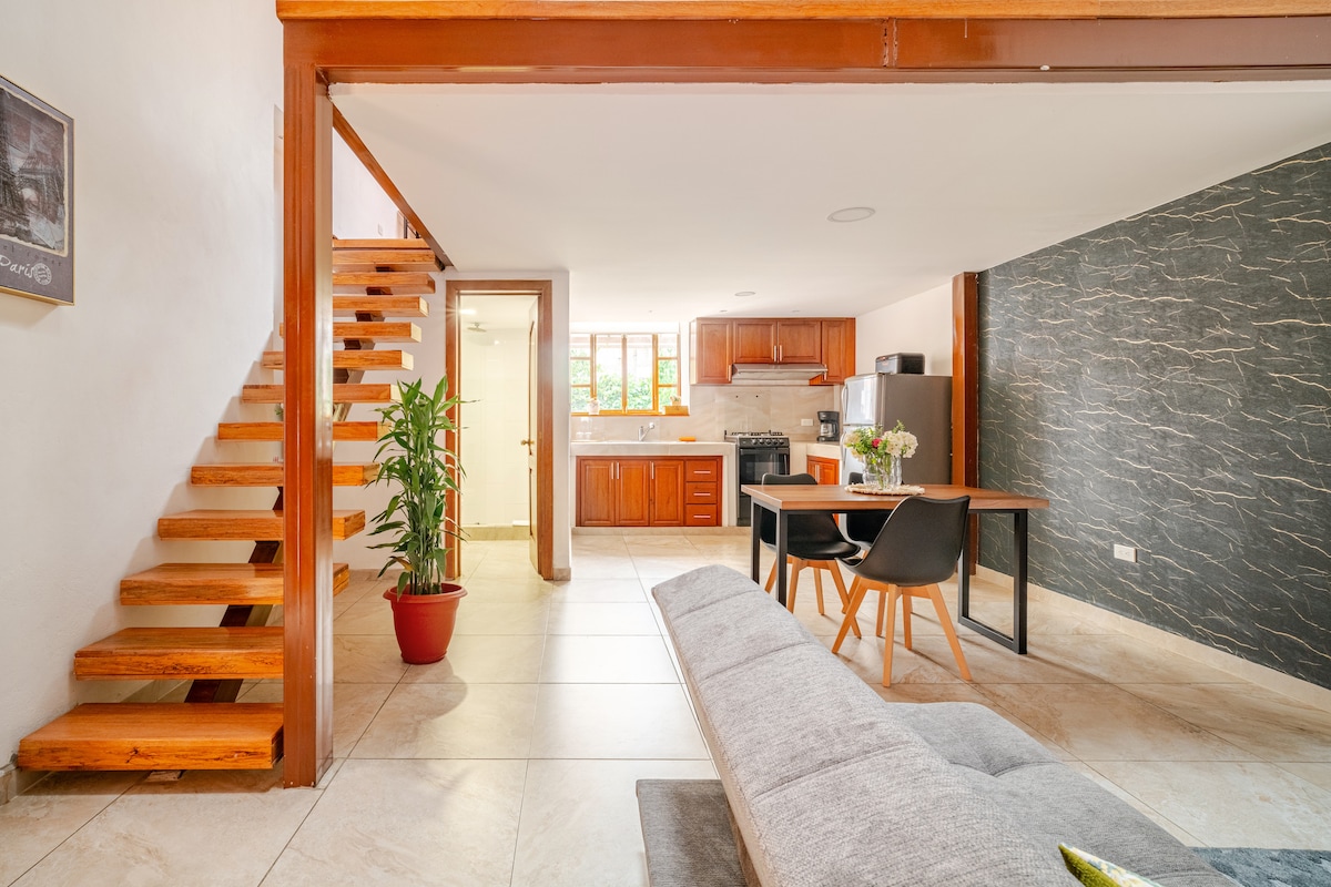 Cozy apartment remodeled in the colonial quarter of Quito, located on the third floor, a loft with a spectacular panoramic view of the Historic Center. It has two bedrooms, two bathrooms, a living room, a dining room, and a kitchen equipped with filtered water and essential implements to meet our guests' needs. The comfortable facilities provide good relaxation. We have Wifi 620Mbps a 1.05Gbps, a telephone line, a television with Netflix, and heaters for the shower and kitchen sinks.