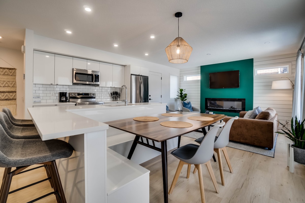 Rustic/modern decor with charm. Cozy master bedroom with king size bed and Smart TV. Two additional bedrooms with queen size beds. Perfect for families! ✧ 1400 sq ft ✧ 8 minutes to downtown core/ICE District ✧ Fully fenced yard with water feature & hot tub ✧ Parking for two + street parking ✧ Smart TV’s/Cable ✧ Keyless entry ✧ Tim Horton’s coffee grounds provided