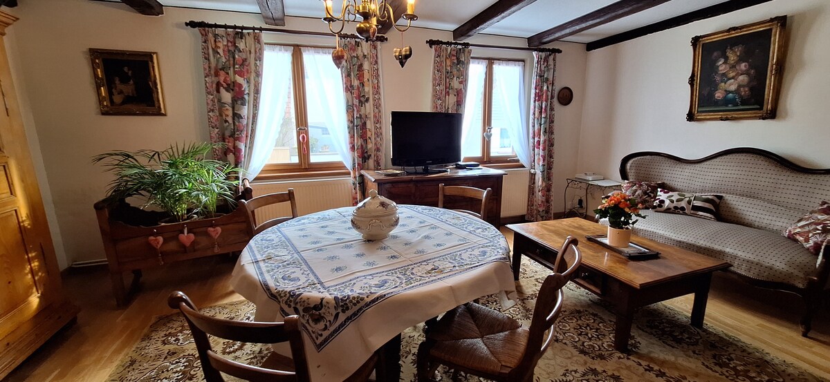 Located in a small village in central Alsace, 30 minutes from Strasbourg and Colmar. Close to Europa Park, the new video games museum, Christmas markets, the wine trail, gourmet markets etc. The apartment is 80m2 and is part of a large typically Alsatian house. It has its private entrance and its private terrace. You also have access to the garden. Possibility to accommodate max 6 people. Perfect for a quiet holiday close to things to do to satisfy all ages!