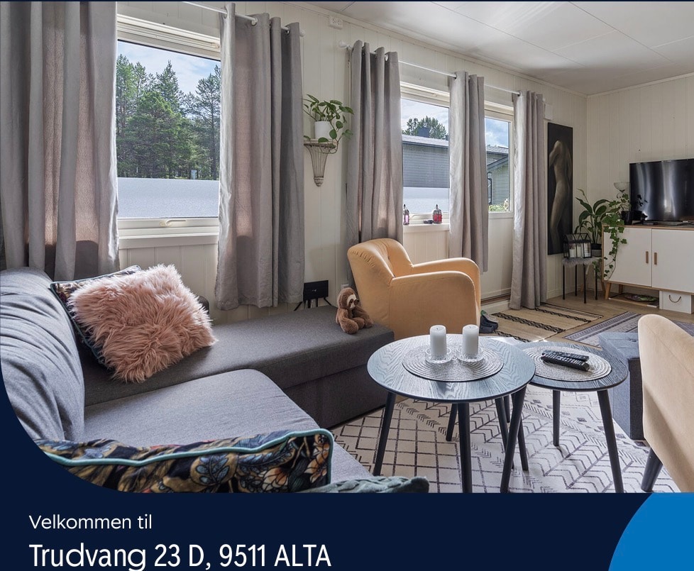 Leilighet med nydelig utsikt over Altafjorden. Leiligheten har egen inngang, stue, kjøkken, bad, vaskerom og 2 soverom. Leiligheten ligger ca 15 minutters gåtur fra sentrum hvor du finner kjøpesentre, Nordlyskatedralen, kino, restauranter, barer og mye mer. 5 minutter gåtur til matbutikk. Beliggenheten er perfekt for de som liker og holde seg aktiv da lysløype og turstier starter like ved huset. Bil kan følge med i leien for et påslag i prisen. Ta kontakt ved interesse.