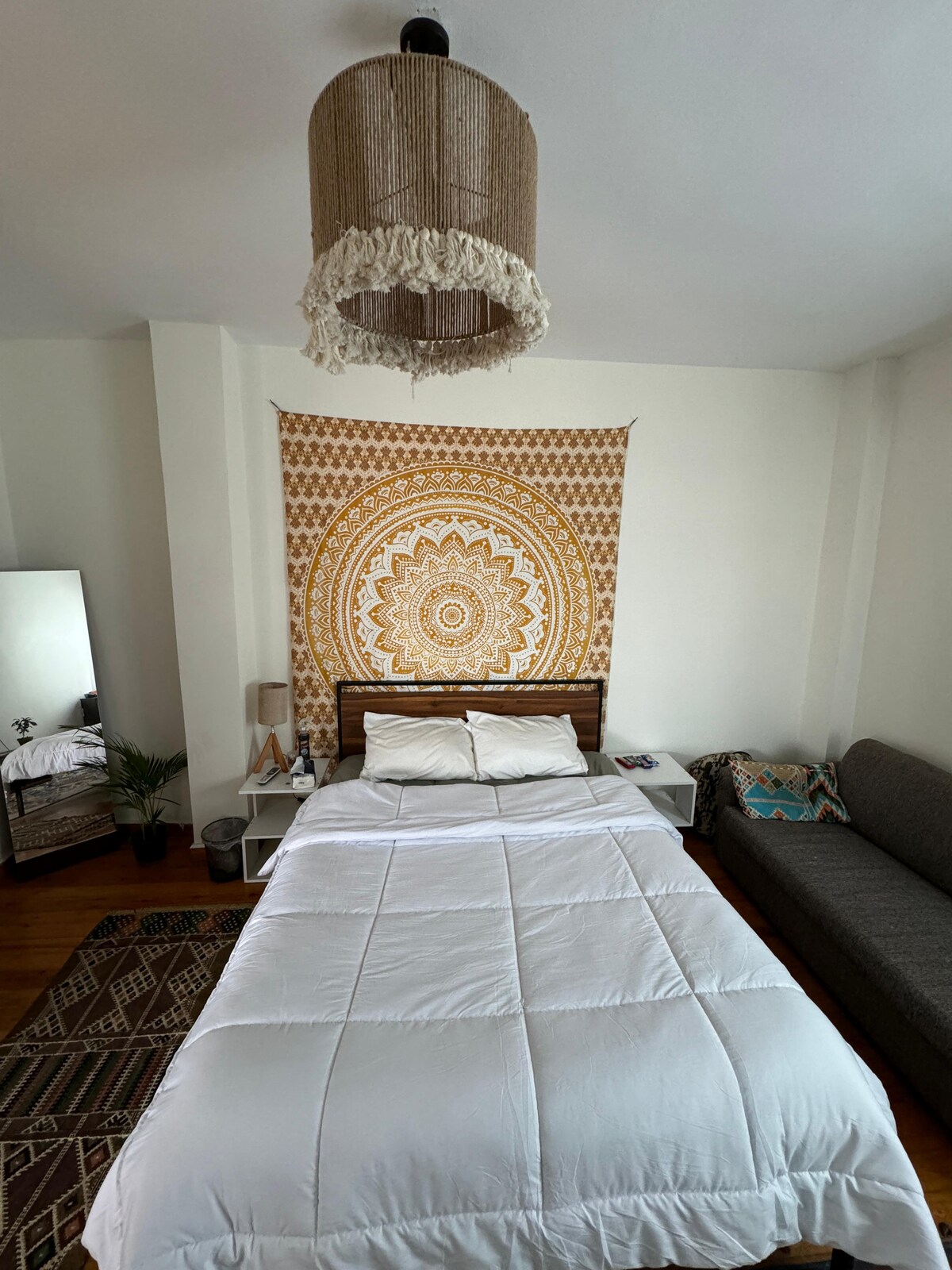 A comfy modern rooftop studio with a private spacious outdoor area that has a basic crossfit gym the studio is a 2 bedroom studio a bedroom that has a king size bed , a big wardrobe, dressing table and a studying desk the bedrooms has its own private bathroom and a living room with an American kitchen also has a wide comfy couch for guests to use as an extra space for sleeping can accommodate 2 guests easily the studio is air-conditioned and has a WiFi free access has all cooking utilities