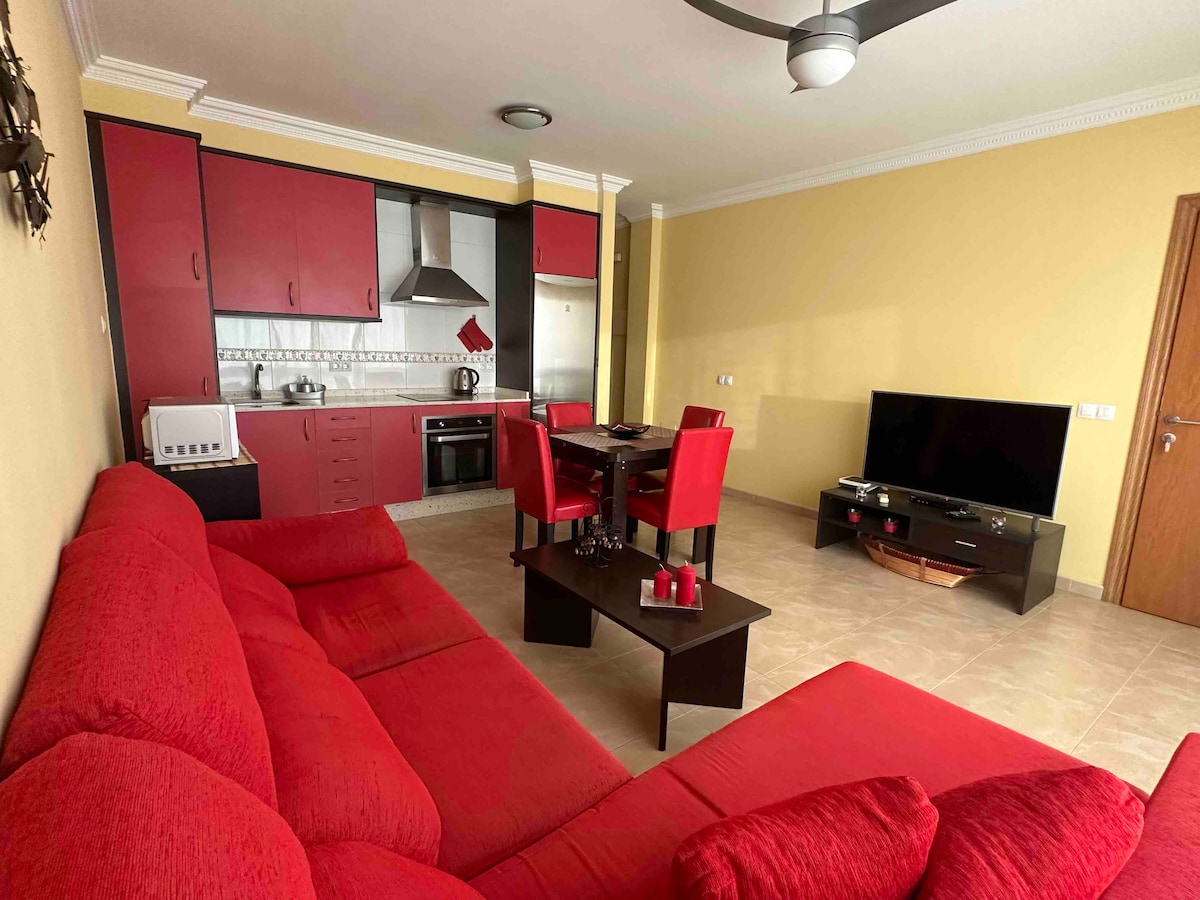 Very bright apartment with Wi-Fi, SmartTV (Netflix and Primer Video), in one of the best areas of Corralejo, in the center. All restaurants are within walking distance, Hiperdino is just around the corner, post office, banks, bazaar, printing shops to print documents, gas station, cafes, playground, soccer field, no need to take the car at all, there is even a small beach just 100 m away. Spacious, clean house, 1 sofa bed, large shower, 2 140 cm double beds in bunk beds with TV.