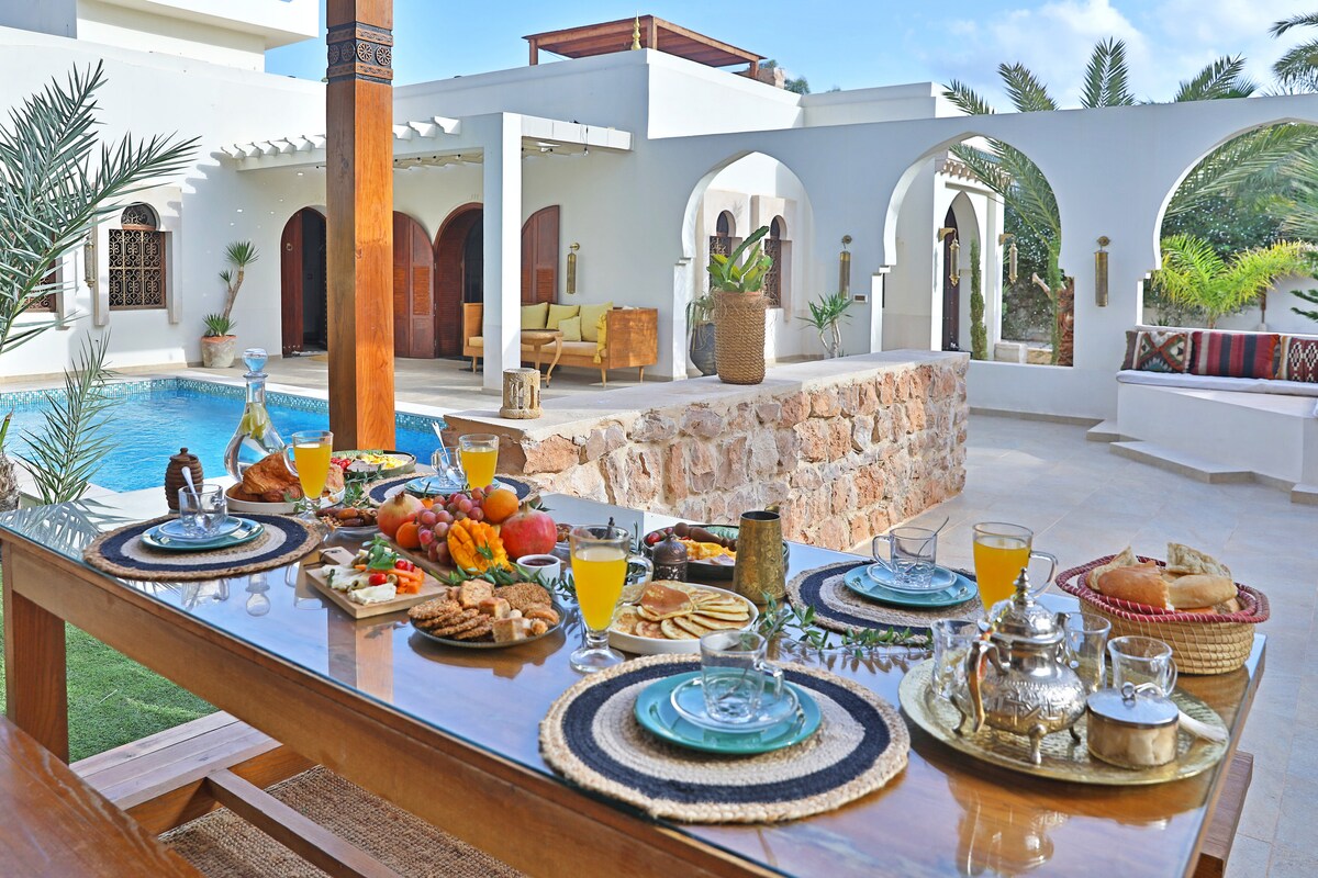 Sublime cathedral rooftop villa, offering three refined suites, a desk and an elegant fireplace for warm evenings. A green patio and traditional pottery infuse authentic Djerbian charm. Outside, enjoy a huge pool, a hot tub (unheated), a semi-buried lounge, a summer kitchen, a pergola and play and relaxation areas, all in a harmonious atmosphere where serenity, authenticity and Mediterranean art of living mix.