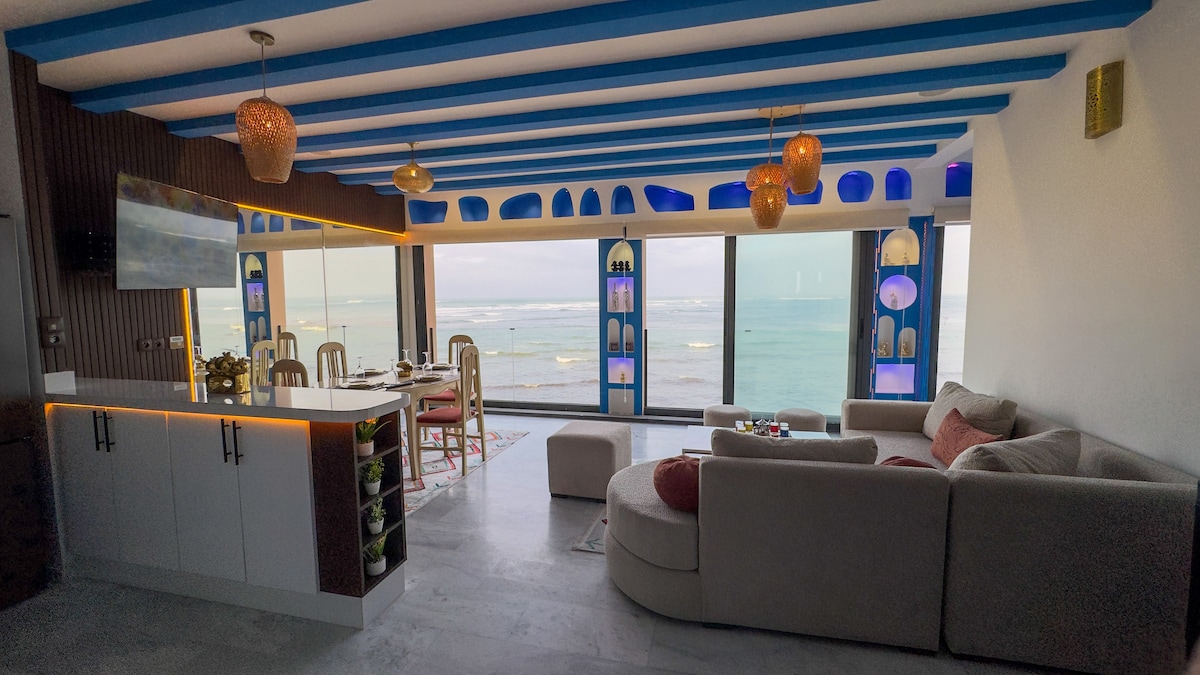 Welcome to our modern, cozy apartment where comfort meets style. Enjoy a bright living room with navy sofas, a sleek kitchen, and a dining area for six. The space includes fast WiFi, a flat-screen TV (Bein sports, IPTV service), and elegant décor. Large windows fill it with natural light and calm energy. Just 3 mins to the train station, 2 mins to Carrefour and 5min driving to the beach & City Center…(not allowed to unmarried couples) Perfect for relaxing short or long stays.
