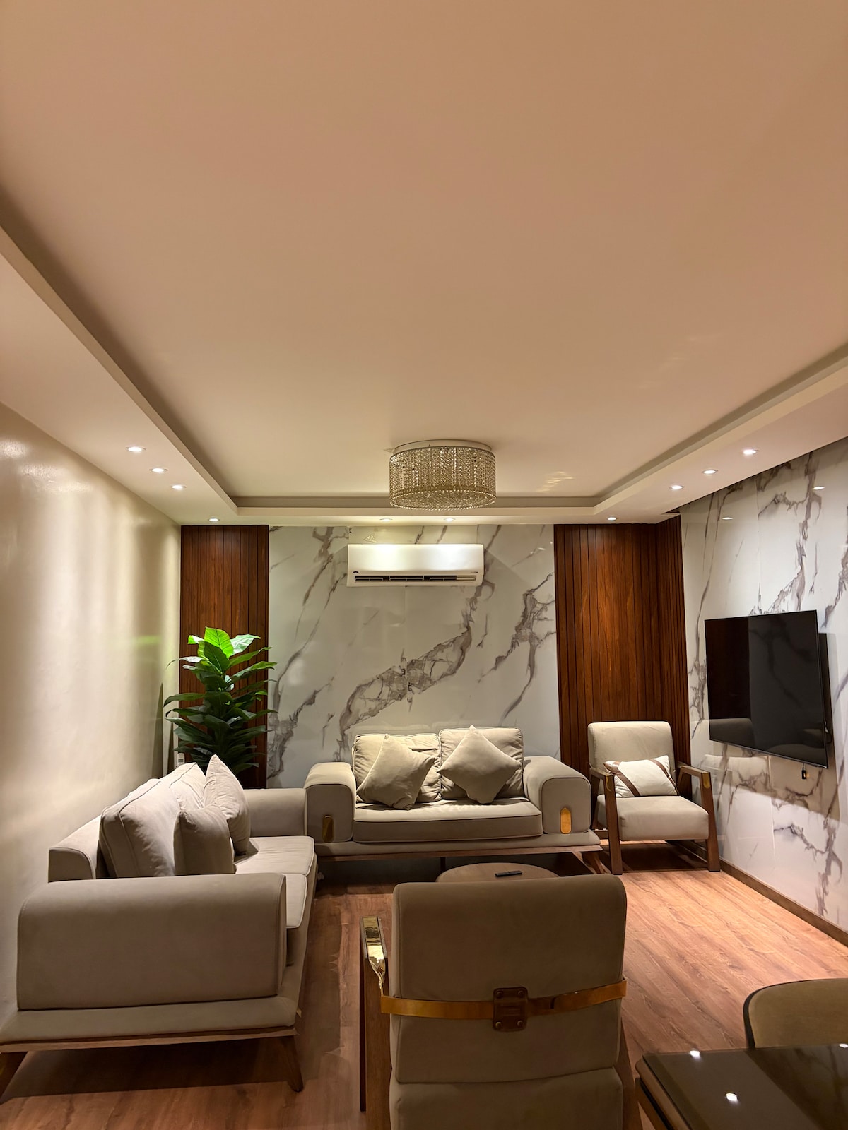 Modern & spacious 4-bedroom apartment with 3 clean bathrooms, perfect for families and groups. Stylish living area with elegant marble finishes, warm lighting, and comfortable seating. Fully air-conditioned with cozy bedrooms, fresh linens, and hot water. Ground-floor unit with a private patio for relaxing. Located in a calm residential area with easy access to shops and main roads. Ideal for short or long stays.