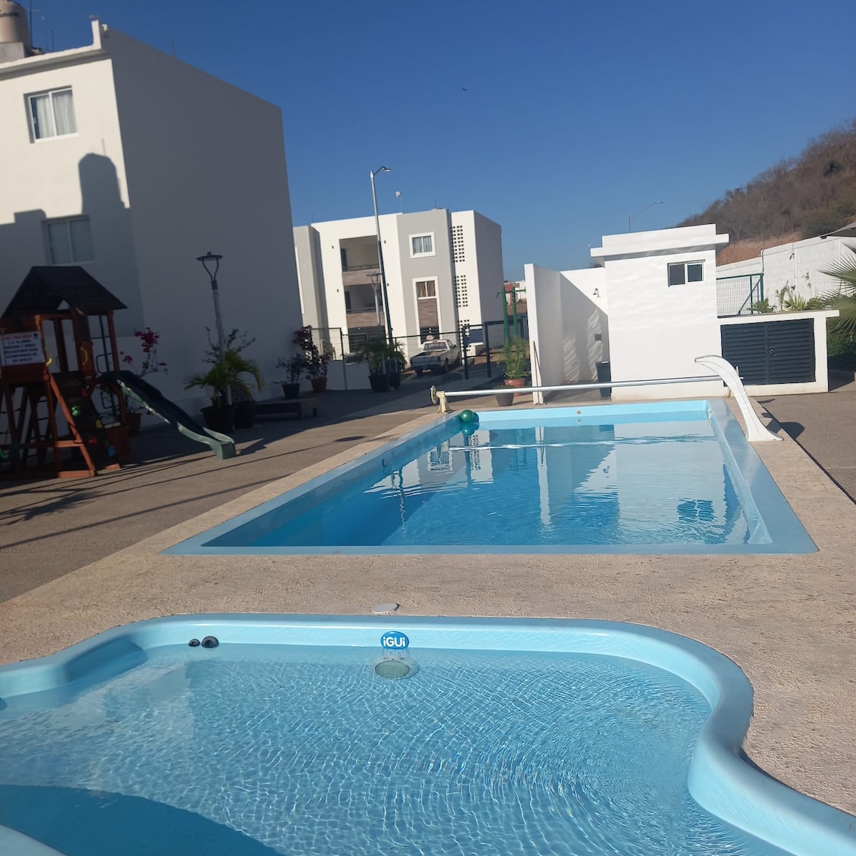 Visiting Mazatlán? Great! We have a superb place. Apartment 2 has what you need: ✔️ First-floor location 🔒 Inside a secure building, accessible by codes 🛏️ Queen bed for 2, max 4 if you rent an inflatable mattress ($300 MXN) 🚽Bathroom 🌬️ Minisplit (AC unit) 🥄 Equipped kitchen 📺 Smart TV 🚀 Internet Plus, there is a terrace with a pool, grill, and bar lounge available on the 3rd floor. 5 min. from the Golden Zone (Zona Dorada) and close to restaurants, Soriana, and Walmart.