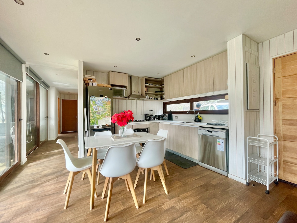 A minimalist 150 M2 two-story house, unique architecture, it is in the middle of a native forest, totally clear view over the valley, large Tinaja, living room with open kitchen, triple height access hall, two large master bedrooms, super King beds, heating C/Pellet stove, terraces on two levels, grill, Starlink Internet, to go up it is necessary to have a 4x4, if you do not have your car it is stored below and we will take you up *Tinaja is charged separately. *We have massages!