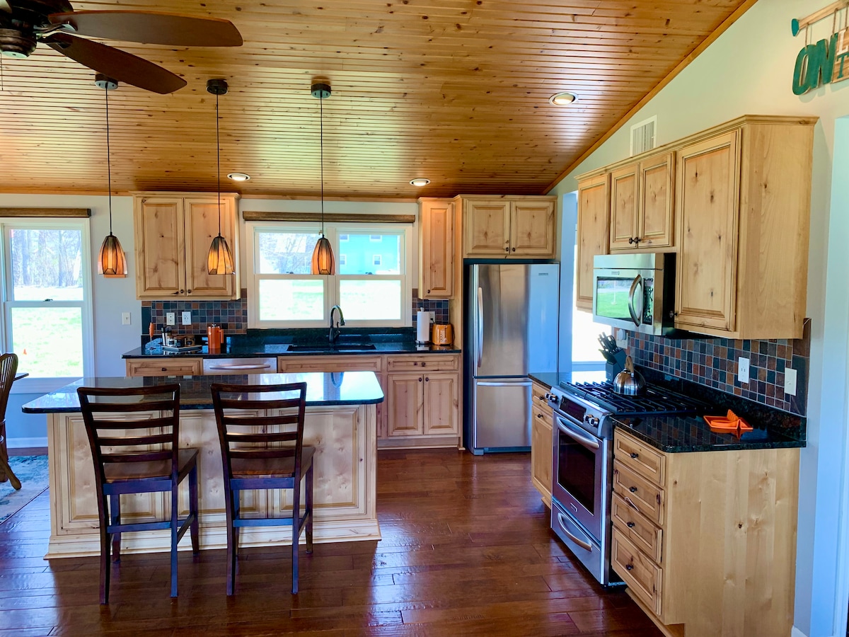 Nurture your most important relationships at this peaceful authentic log cabin, built in 2022, set halfway in the long lane of our 18 acre property. Enjoy privacy with the massive pine trees behind you. Relax on the front porch and watch the sunset beyond the horse pasture and cornfields. The cabin boasts Wi-Fi, TV screen w options,a soaker tub, queen bed, recliners with heating feature, a full kitchen stocked with pots and pans, a washer and dryer. Everything you need for a longer stay.