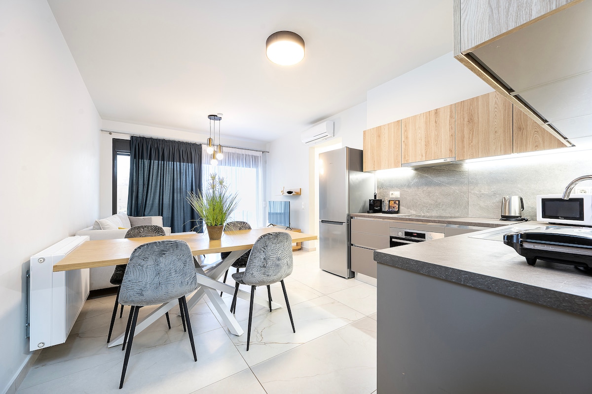 Welcome to our brand-new, stylish, and modern accommodation, perfect for group and family trips. Step inside our thoughtfully designed apartment, where contemporary aesthetics seamlessly merge with comfort. From stylish furnishings to modern color palettes, our interiors exude sophistication and warmth, complemented by an abundance of natural light. Every detail has been meticulously considered to create a space that feels like a true home away from home.