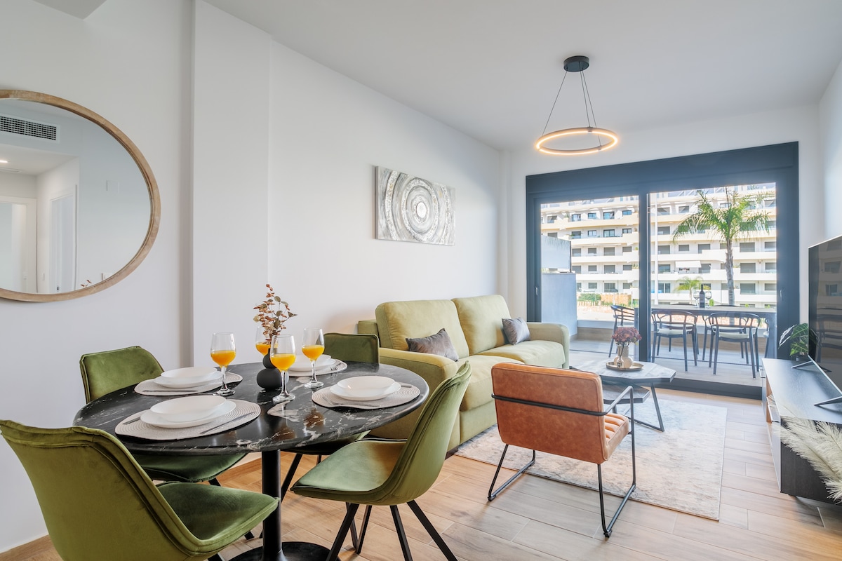 Relax and unwind in our quiet and elegant apartment, with magnificent ocean views and dreamy sunrises. The location is perfect, just a few minutes from the airport and 12 km from Alicante. It is an open and light-filled space, with two spacious bedrooms each with their own bathroom. Fully equipped, so you can enjoy some incredible days and an unforgettable vacation. We are open to any questions.