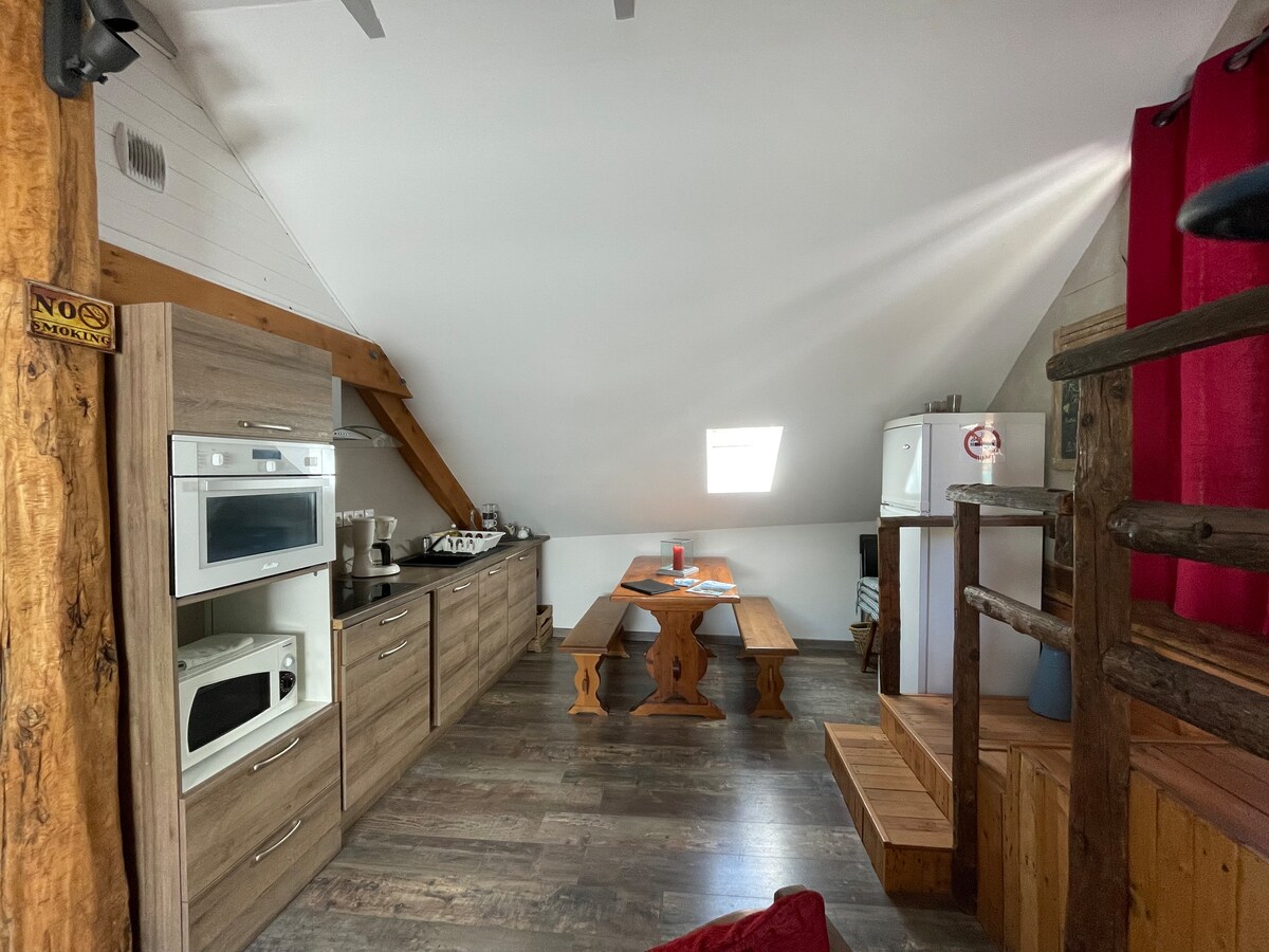 Summer and Winter, La Verdoyante, charming wooden mezzanine studio located on the heights of Embrun at 1080 m altitude, in a very quiet hamlet. Comfortable accommodation for 2 people adjoining the house with a separate entrance. Tree-lined garden with dedicated spaces. Great views of the mountains. Downtown/Train station 10 minutes and Lac de Serre Ponçon 15 minutes. Free shuttle. Embrun, city of Art and History, named "Tourist Resort". Nearby ski resorts Les Orres, Réallon, Crévoux