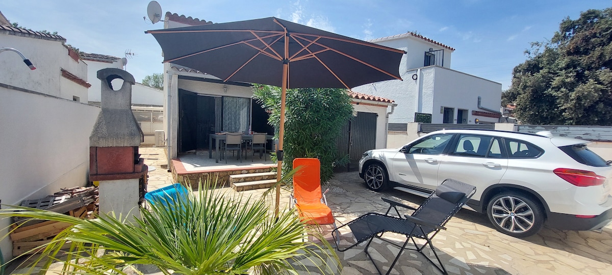 Pet Friendly / Bike friendly . Bonica acollidora casa, per gaudir d'unes bones vacances.A la zona del porxo hi ha una taula per poder dinar o sopar sota les estrelles i butaques per fer una sobre taula. Disposa de barbacoa.A la part posterior de la casa, es podran relaxar fent un aperitiu o tombats a les còmodes tombones.A l'interior hi ha 2 habitacions amb amplis armaris, al menjador sofà, tv i aire condicionat. La cuina disposa de rentaplats,cafetera dolce gusto, melita i microones.