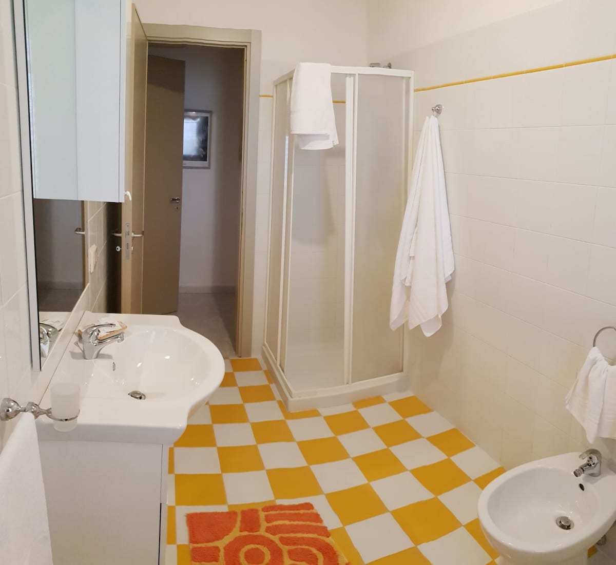 La camera al primo piano è ampia e luminosa, con arredamento nuovo e lineare. Le serate sono fresche, ma è presente un ventilatore a soffitto. La stanza da bagno è spaziosa, dotata di vasca e doccia a pioggia, accessibile direttamente dalla camera. Abbiamo riservato una porzione di terrazzina per asciugare teli e costumi.